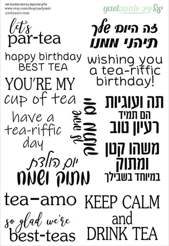 גליון בגודל 13*19 ס"מ המכיל מדבקות ברכות בכתב שחור על רקע שקוף לקישוט תגיות, כרטיסים ואריזות מתנה
