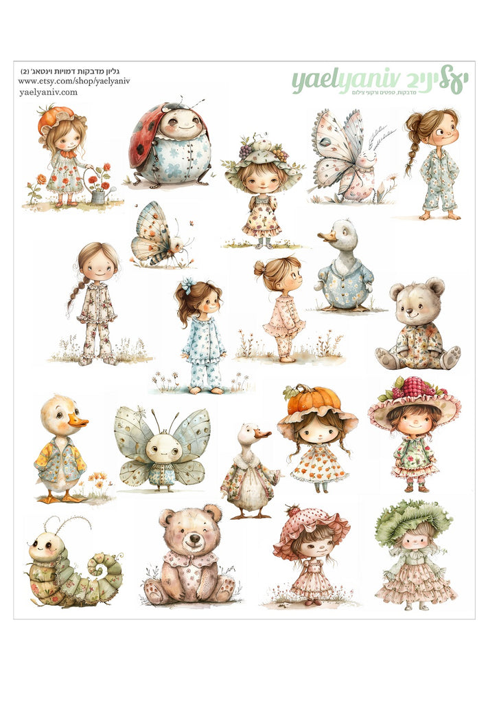 גליון מדבקות בגודל 24*30 ס"מ עם איורים של ילדות מתוקות בסגנון וינטאג'